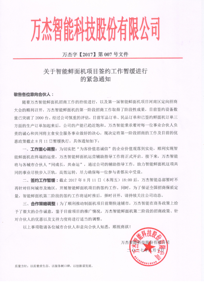 敬告各位意向合伙人: 隨著萬杰智能鮮面機(jī)招商工作的持續(xù)進(jìn)行,以及第一屆智能鮮面機(jī)項(xiàng)目河南區(qū)定向招商大會的順利召開,萬杰智能鮮面機(jī)的第一階段招商工作取得了階段性成果,目前簽約設(shè)備數(shù)量已突破了2000臺。經(jīng)過公司慎重的評估,目前軍品訂單、民品訂單和已簽約鮮面機(jī)訂單三方面的生產(chǎn)訂單加起來后,公司的產(chǎn)能已趨近飽和。萬杰智能秉承著對每一位事業(yè)合伙人負(fù)責(zé)的誠心和共同將主食安全服務(wù)事業(yè)做好的決心,現(xiàn)決定將第一階段招商的工作及目前的優(yōu)惠政策截止8月11日暫緩執(zhí)行,具體通知如下: 一、工作重心調(diào)整:為切實(shí)把“為客價(jià)值忠誠信”的企業(yè)價(jià)值觀落到實(shí)處,順利實(shí)現(xiàn)智能鮮面機(jī)在終端的運(yùn)營,萬杰智能鮮面機(jī)運(yùn)營輔助指導(dǎo)工作將正式開啟。接下來,萬杰智能將與各城市合伙人“同成長,共命運(yùn)”,通過公司的輔助指導(dǎo)工作,助力智能鮮面機(jī)這項(xiàng)共同的事業(yè)盡快步入正軌,高效運(yùn)轉(zhuǎn),盡力確保每一位參與者都從中受益。 二、簽約工作暫緩:截止2017年8月11日(本周五)18:00后,萬杰智能總部暫時(shí)不再針對任何城市及地區(qū),開展智能鮮面機(jī)項(xiàng)目的簽約工作。同時(shí),為了保證全國招商保質(zhì)定量,智能鮮面機(jī)第二階段的簽約工作將適時(shí)推后,擇時(shí)召開,請持續(xù)關(guān)注公司動(dòng)態(tài)。 三、合作策略調(diào)整:為了順利推動(dòng)制面機(jī)項(xiàng)目前期快速鋪市,萬杰智能在商務(wù)政策上給予了很大的合作誠意,鑒于目前項(xiàng)目的推廣情況,萬杰智能鮮面機(jī)第二階段的招商政策、針對合伙人的優(yōu)惠以及支持力度將進(jìn)行適當(dāng)?shù)恼{(diào)整。 以上事項(xiàng)敬請各位城市合伙人和意向合伙人知悉,順祝商祺!