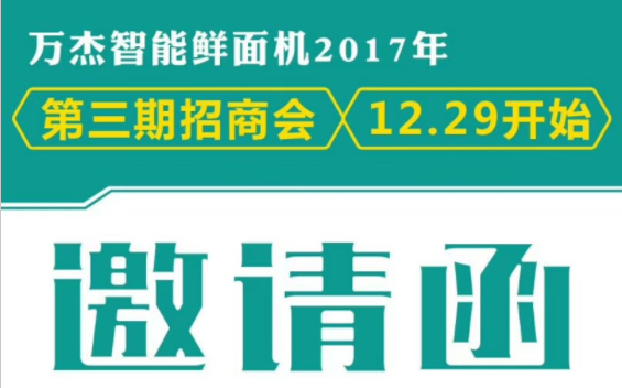 2017年即將過去,這一年,萬杰智能收獲滿滿,智能鮮面機(jī)商業(yè)模式逐漸成型,全國招商火爆持續(xù),熱度不減,萬杰智能衷心的感謝合作伙伴的支持與信任。乘著2017年精彩不斷的“尾巴”,為回饋客戶的期待,萬杰智能現(xiàn)決定正式召開第三期招商會(huì)。