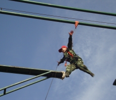 高空斷橋:在距離地面8米的高空搭起了一座獨(dú)木橋,而這個(gè)橋的中間卻是斷開(kāi)的,間距1.2米-1.4米,要求每個(gè)隊(duì)員爬上8米的高空后,在空中躍起,從橋的這側(cè)跳到另一側(cè), 雖然身上掛滿了安全保護(hù)措施,但在高空跳躍,每個(gè)人都產(chǎn)生了或多或少的恐懼感,從爬上去站到高空已是一次極大的考驗(yàn),從高空躍到對(duì)面更是一次心理的挑戰(zhàn)。有的同伴從滿臉通紅到面色蒼白,有的戰(zhàn)戰(zhàn)兢兢不敢站立,有的站了許久不敢躍起,還有的上去之后直叫:“我有恐高癥!是真的……”在隊(duì)長(zhǎng)的帶領(lǐng)下,我們?yōu)槊恳粋(gè)參訓(xùn)的隊(duì)員“加油”,目送他們一個(gè)一個(gè)爬上搖搖晃晃的高桿,然后不斷呼喊他們的名字,每完成一個(gè)步驟都熱烈地鼓掌高呼。結(jié)果,全隊(duì)20多名隊(duì)員都順利完成了這項(xiàng)訓(xùn)練,zui后大家用熱烈的掌聲慶賀自己的成功和勝利。 此項(xiàng)目心得體會(huì):表面看起來(lái)很難的事,其實(shí)并沒(méi)有想象中那么可怕。在工作、生活中,遇到困難并不可怕,怕的是失去解決困難的勇氣和信心!心理的障礙是zui難逾越的,我們?nèi)绻蔀閺?qiáng)者,首先就必須挑戰(zhàn)自己的恐懼感,當(dāng)我們豁出去一搏,勇敢地跨出一小步,也許就能抓住屬于自己的機(jī)會(huì),實(shí)現(xiàn)人生一大步的跨越。