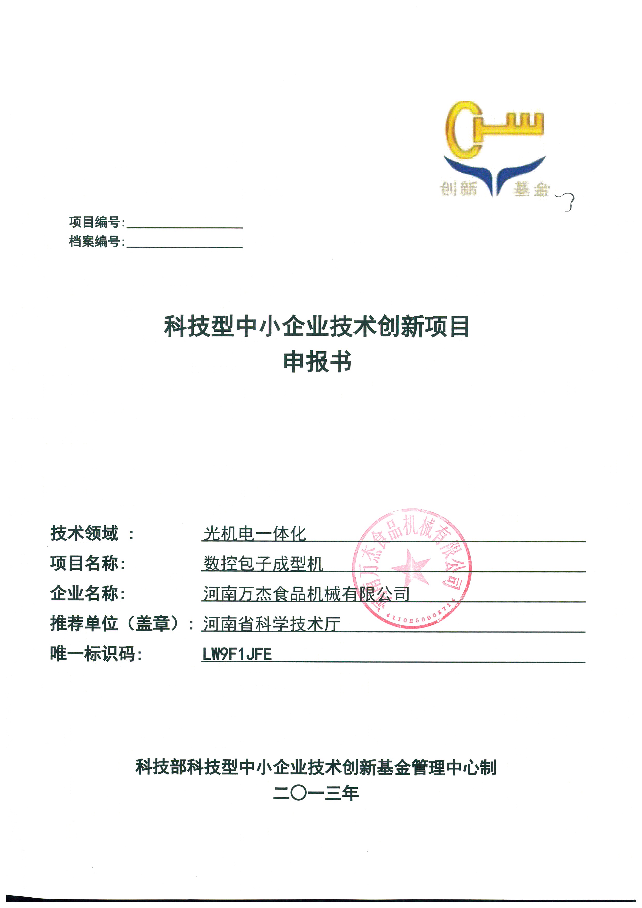 | 6月26日,河南萬杰歷時一年半申報的“數(shù)控包子成型機(jī)”創(chuàng)新基金項目通過省級評審,獲支持資金10萬元,并推薦國家進(jìn)行審核,有望獲得80萬元支持資金。